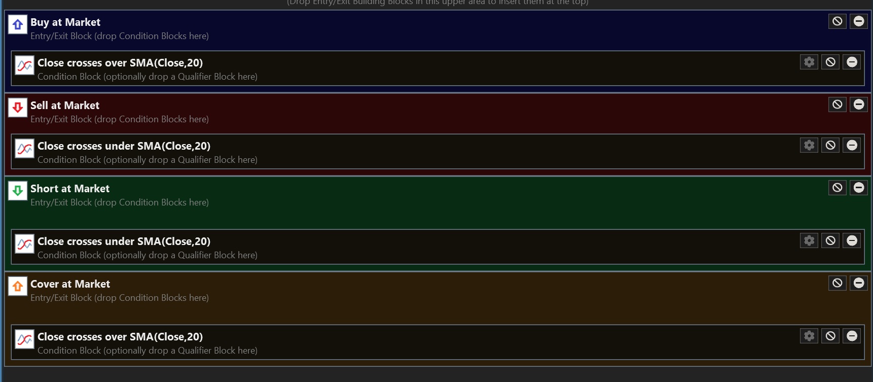 Probably this has been asked before. What is the proper way to set up a reversing positions block strategy. I noticed sometimes the short entry only exists the current long position but doesn't enter the new short trade. I think in the case of IB it only reads Buy or Sells. See images below.