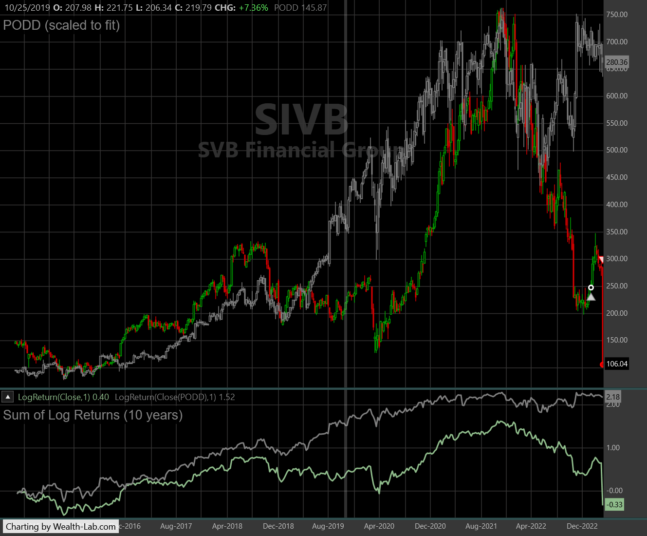 So here's a good example of survivorship bias in near real time. PODD is rescaled here to fit in the 10-year weekly SIVB chart. Pretty similar trend prior to about April 2022, but certainly a negative correlation since then!