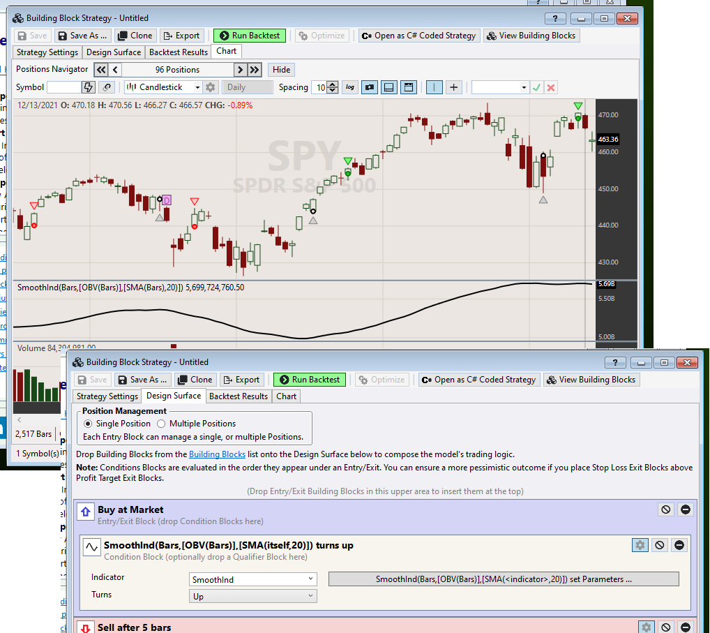 Ideally, I would like to test whether a positive slope OBV trendline can help filter out bad trades. I understand that OBV (bar) > OBV(bar-n) is essentially the same (and can be achieved in block builder), but I would like to use a trendline instead, so I can easily spot a positive slope SMA (or EMA, etc.) when doing a quick glance at a chart.