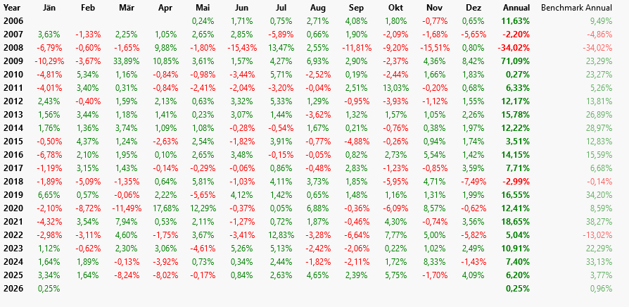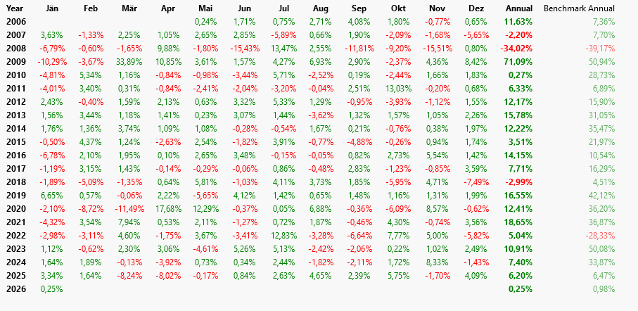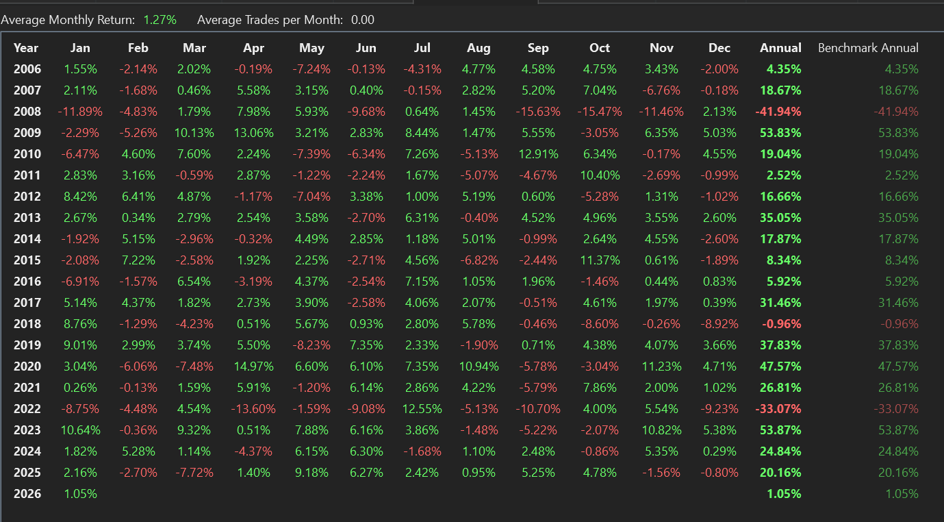 The benchmark buy & hold starts on the StartIndex, which is when the indicators become valid and the strategy can start trading. If using a 200-bar moving average and testing for 2025, the benchmark buy & trade would have started with the opening trade on (or around) 22-Oct-2025 and ended with the close on 31-Dec. That one would be a 1.46% gain and about 7.8% APR.