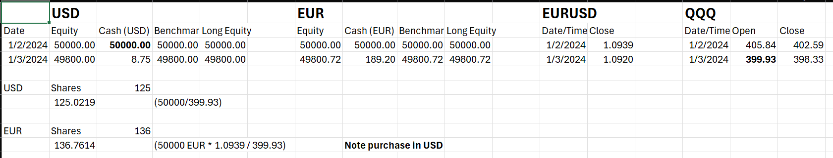 The EUR backtest equity is shares x price / exchange rate + cash, giving a value in Euros. There was a small difference (right-most column) that I can't reconcile at the moment (it could just be a precision issue), but in general it appears that the calculation is correct.
