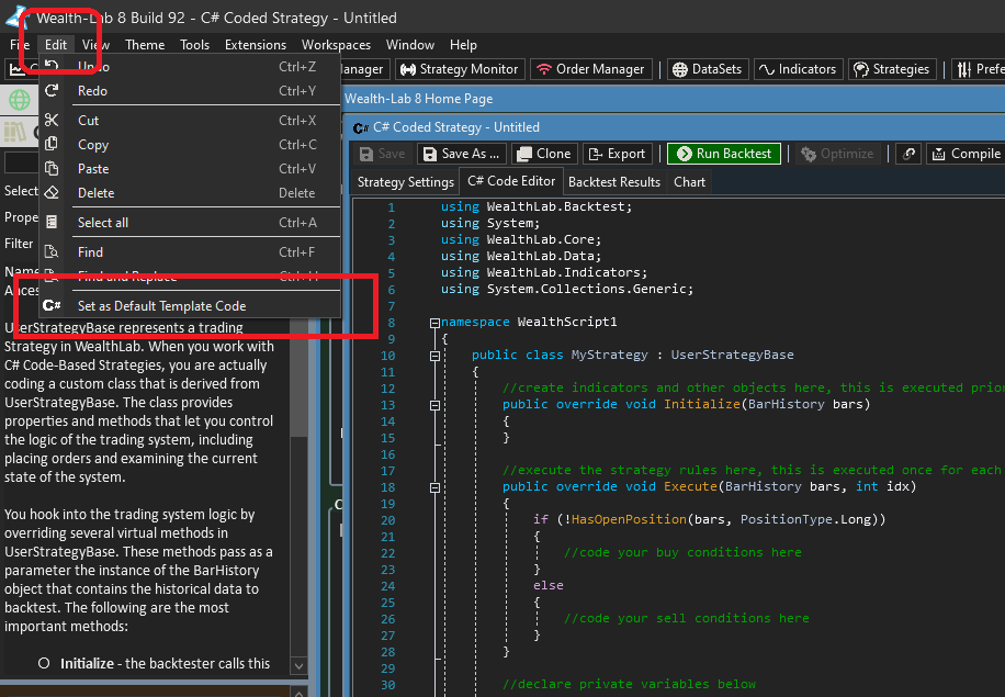 An editable template which appears when you open a new C# Strategy was a WL6 feature.