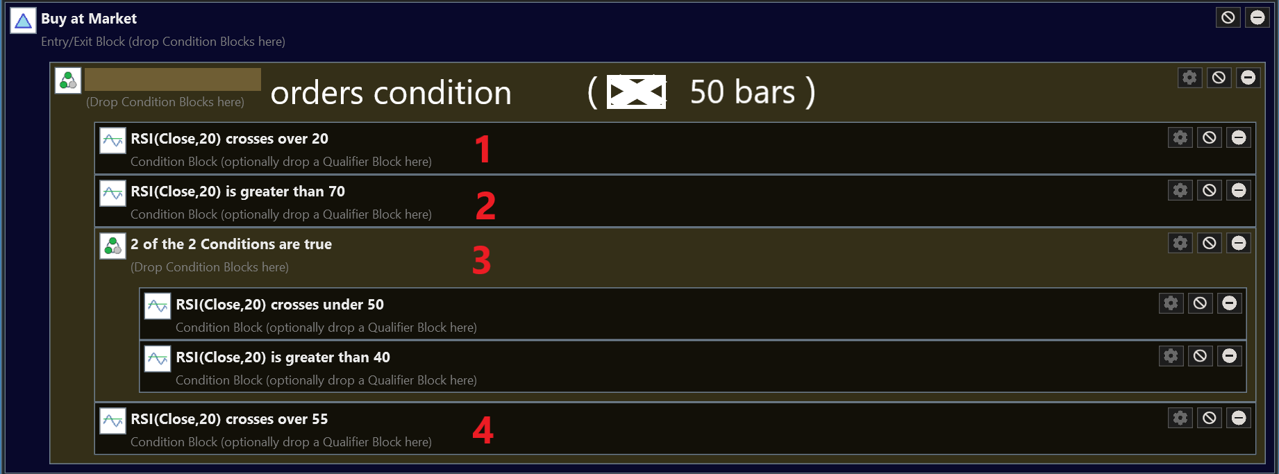 It's easy to see where "3" would be violated - if RSI(20) didn't remain above 40, so that would "reset" the sequence to wait for "1" again. It's not clear what you should do if you went above 70 ("2") below and then above it again. Is that a reset? Probably not.