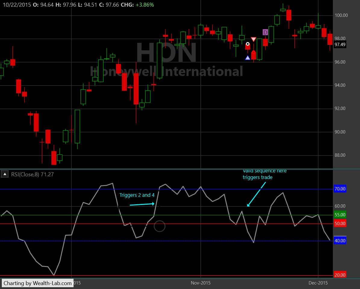 Here you'll see a problem even that you wouldn't expect. Everything was going according to plan, but then Condition "2" AND "4" triggered on the same bar - so now 2 didn't come before 4 and we had to wait for the setup again, which finally triggered the trade.