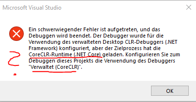 A fatal error has occurred and debugging needs to be terminated. The debugger was configured to use the Desktop CLR (NET Framework) Managed debugger, but the target process loaded the CoreCLR (NET Core) runtime. To debug this project, configure it to use the 'Managed (CoreCLR)' debugger.
