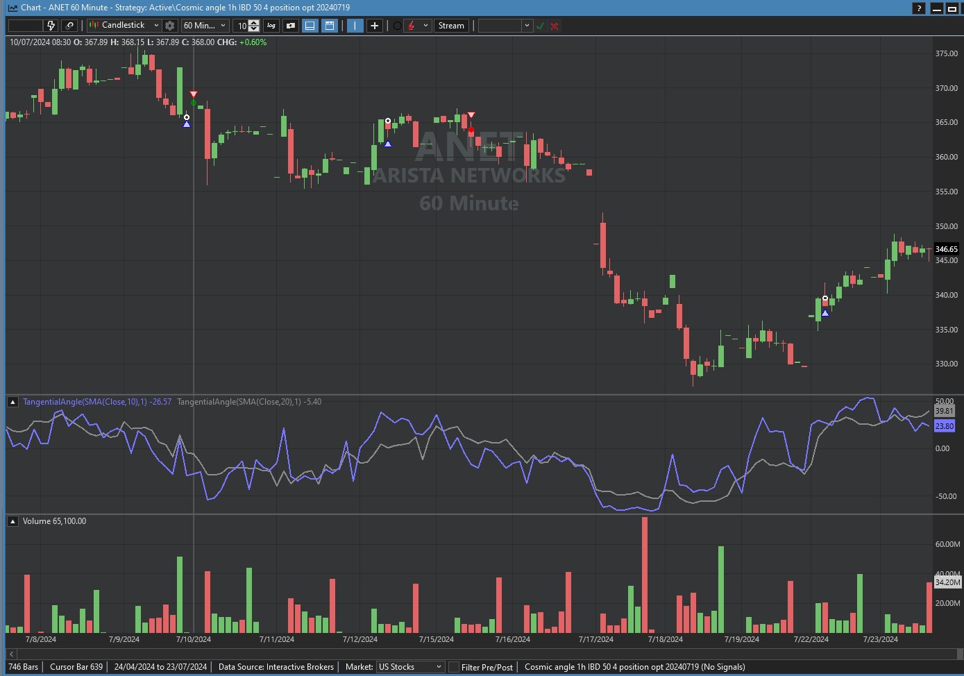 If I pull up a chart using hourly data for a stock from IB pre/post not filtered and add a strategy, the signals are shown on the chart.