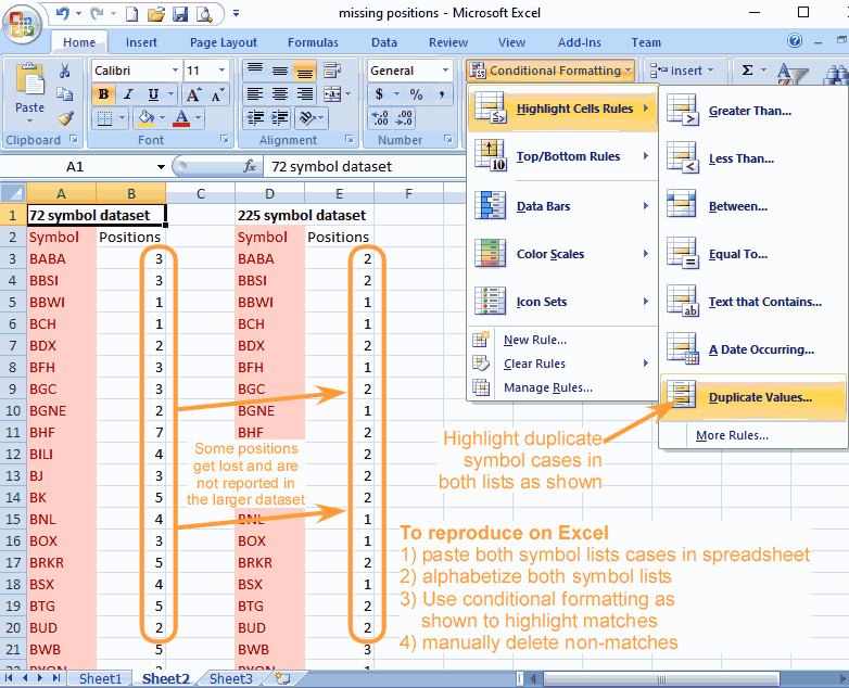 To reproduce this Excel spreadsheet, I'm alphabetizing both pasted By-Symbol lists, then using conditional formatting to highlight just the symbol matches between these pasted lists. Non-matches are deleted for simplicity.