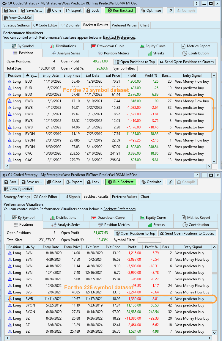 Symbols in larger DataSets are failing to report all their positions in the By Symbol tabulation. All positions appear to be shown in single-symbol mode and in smaller datasets. This problem occurs whether Preferred Values are being employed or not. I don't think the choice of the DataSet matters. I was backtesting with 1500 Daily bars, but that may not matter as long as the Data Range is large enough. I'm running WL8 Build 101.