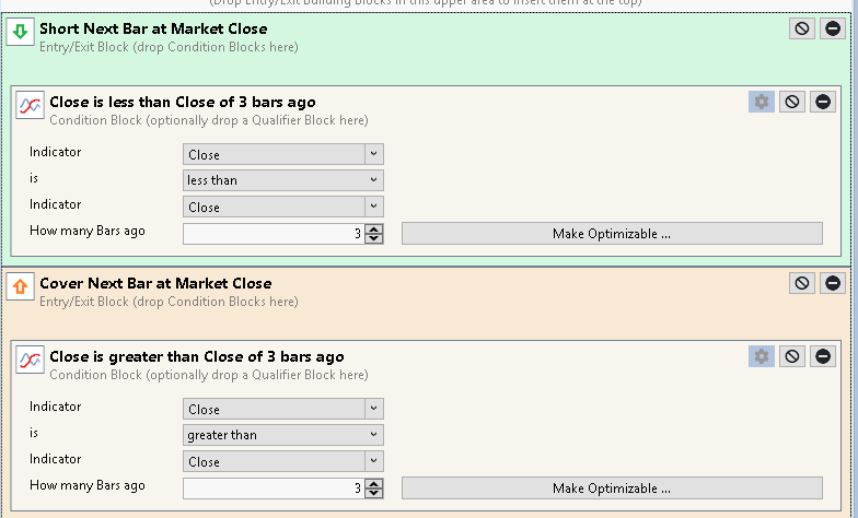 2. Assuming Short/Cover. In Blocks it's not possible to enter/exit on the same bar's close. With the PowerPack extension you can use next bar's close as depicted: