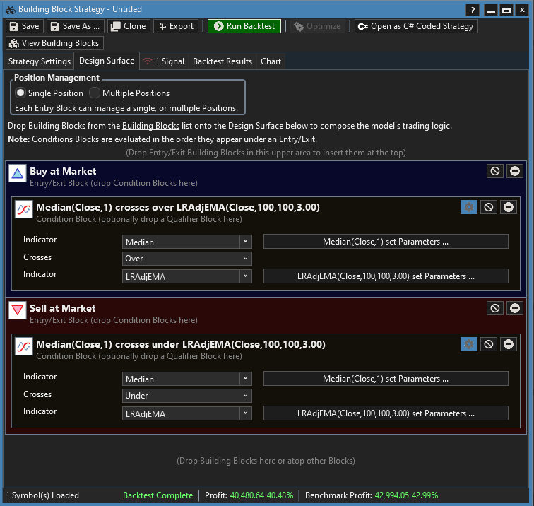 I built a strategy using building blocks that uses crossover signals. However, there are some periods where there are crossovers and the strategy does not produce any signals (Orange circles). Is there a parameter or setting I am missing/misusing?
