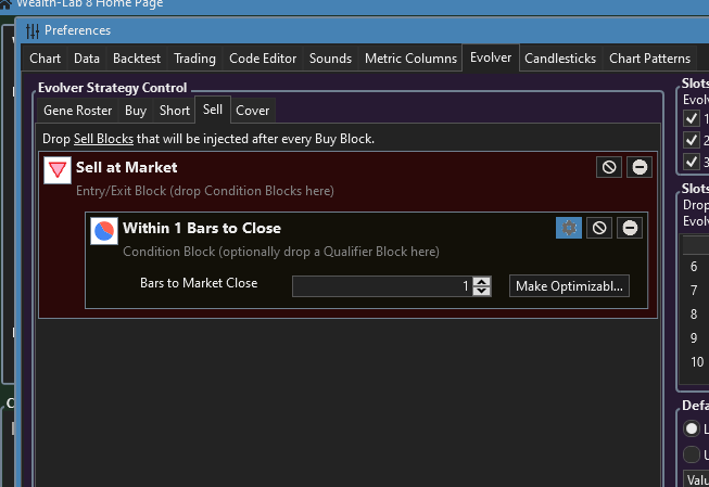 Thanks for implementing this feature, but I don't understand how to use it to find complete intraday strategies. Now we can add conditions for entry, but not for exit, which is necessary for all trades to close before market close. I think we need the same tabs as we have now for Exits blocks too. So we can add an Exit block and the condition Bar of Day is equal to Next-to-Last for example.