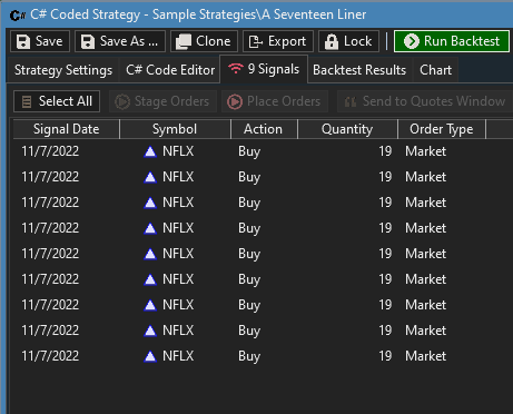 If both of things are resolved the signals should match, like below. Note that below I have different quantities, which I expected because I'm using a % of Equity sizing and am loading only 500 bars in the SM while the Strategy window had more data. So, the equity had more time to build up in the Strategy window, and the quantities are larger.