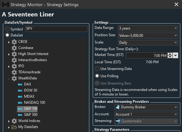2) Ordinarily, I use Wealth-Lab in Offline Mode and that was the case here also as I'm using Polling, not streaming. But for the sake of testing it I unchecked Offline Mode but the result was still the same - no signals.