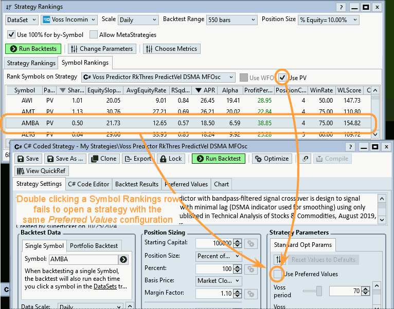 With the Strategy Rankings tool, one can double click a row for Symbol Rankings that will bring up the strategy performing the rankings. However, when running that called up strategy, none of the metrics agree with those in the Symbol Rankings row. On very careful inspection (Yes, it took me 40-minutes to find the problem.), it turns out the Preferred Values setting for Symbol Rankings is not correctly copied into the called up strategy as expected. This explains the metrics discrepancy between the Ranking row and the called up strategy.
