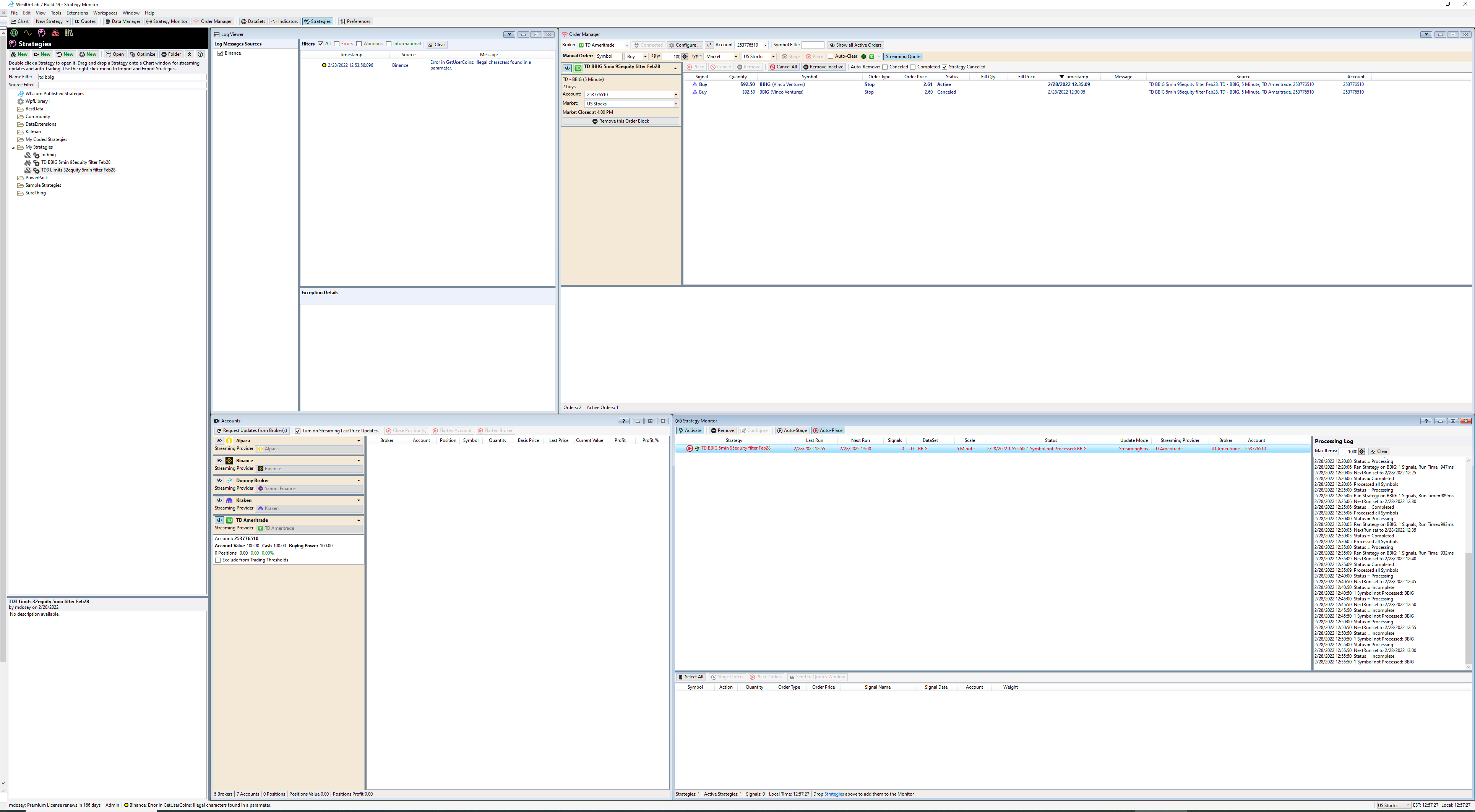 I am using the latest version of WL7 and the TD Ameritrade extension, running a live strategy with the "Streaming Bars" configuration. Everything was working initially, but now I am repeatedly getting "Symbol not Processed". Can you see any reason for this?