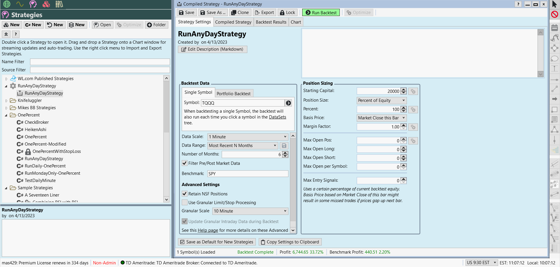 I am running an Intraday strategy using a data scale of 1 minute. My local time zone is US Central. I am using the 09:30 EST Market I previously set up for TQQQ only. Here's my problem. When I run my strategy using let's say 12 months' worth of data, I get a certain profit percent. When I run it again using a different time frame like 3 months, I get the same profit percent. And when I go look at the backtest positions, it only shows me positions from the start of this year. Also, I am connected to TDA.
