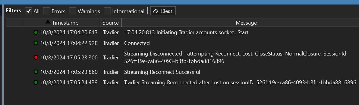 "10/25/2024 08:41:02:175" "Tradier" "Tradier Streaming Reconnected after Lost on sessionID: 9534ffcf-c281-4123-b76d-55a9e453a6d4"
