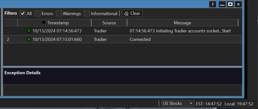 "10/25/2024 11:20:08:922" "Tradier" "11:20:08.920 Initiating Tradier accounts socket...Start"