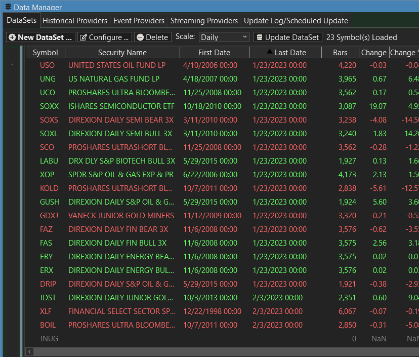 1. The update was this Tuesday, 2/7. It shows "23 symbols Loaded". Yet most Last Date is 1/23 and there is one on 2/3,