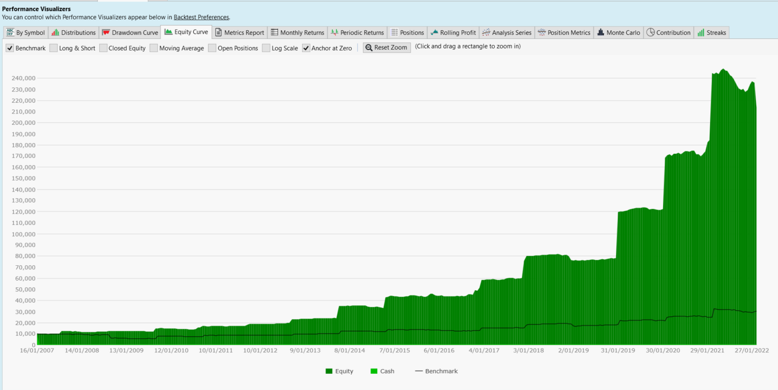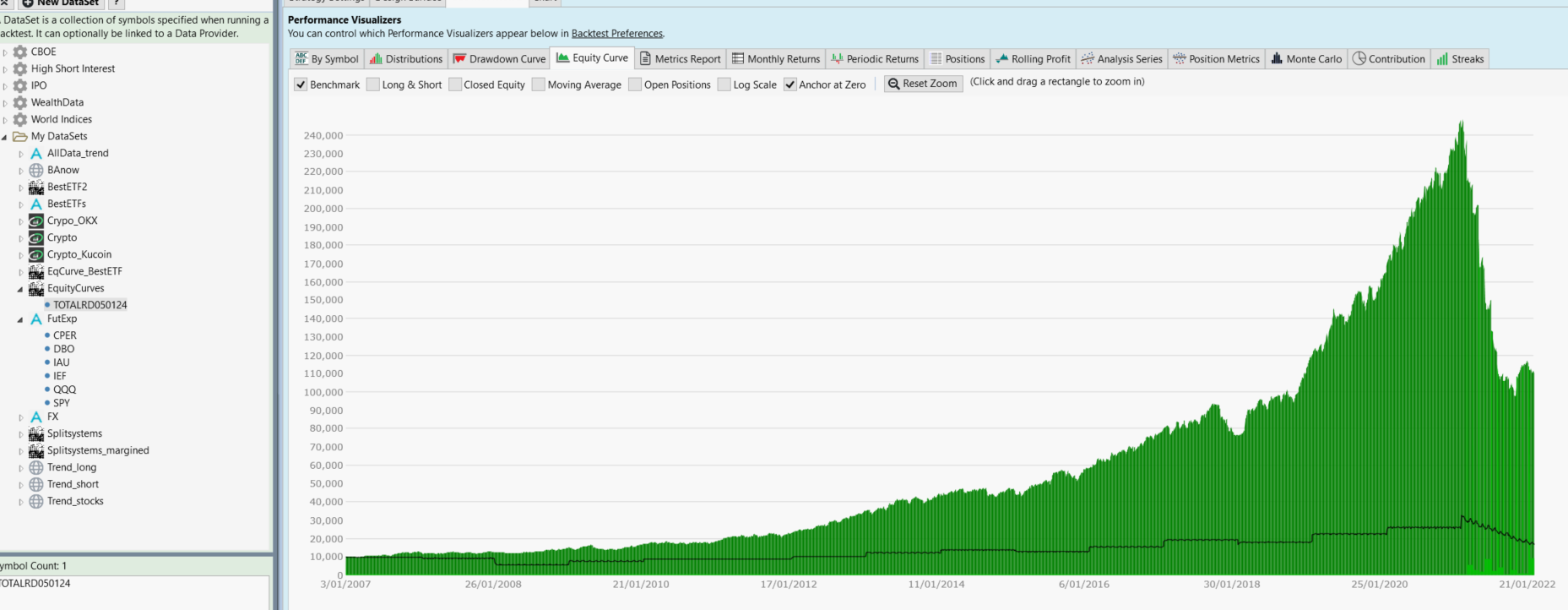 I am using a csv file setup as d/mm/yyyy. It is the only csv file in a folder. Whether I run as a single symbol or portfolio, and whether I use All Data or last x years, I am getting very weird results. The benchmark (SPY) is also wrong - showing big step ups and downs. When I check a SPY chart standalone though it looks normal. The strategy is only a Buy at Market - nothing else and no sell rules (!) - using the Building Block. I wanted to see the statistics on an equity curve I had made in Excel.