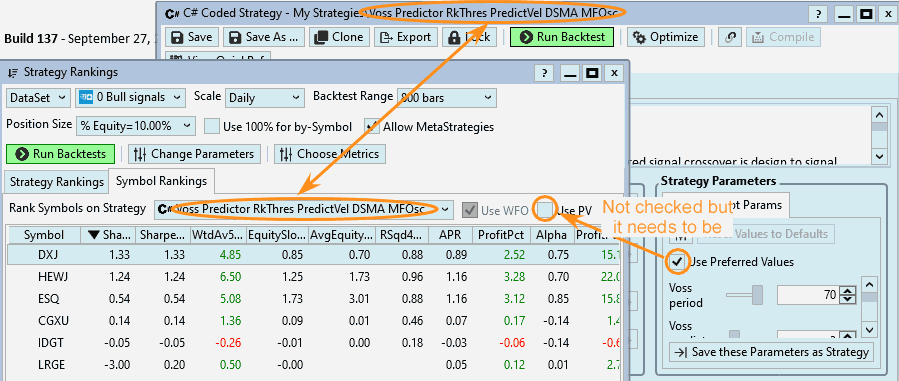 I thought about just having the "Use PV" checkbox in the Symbol Rankings tool automatically match that of the saved strategy setting. But is that a good design for everyone? Maybe not. So maybe a simple warning message on the GUI saying they don't match is better.