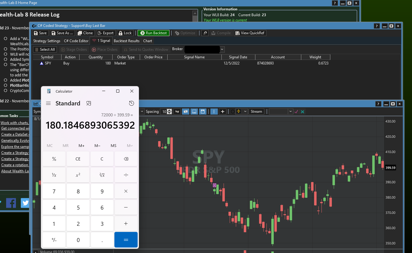I set the starting capital to 100,000 and the position size to fixed amount, 72,000. The last bar of data for SPY closed at 399.59, so I verified that my Signal does have the correct quantity of 180 shares.