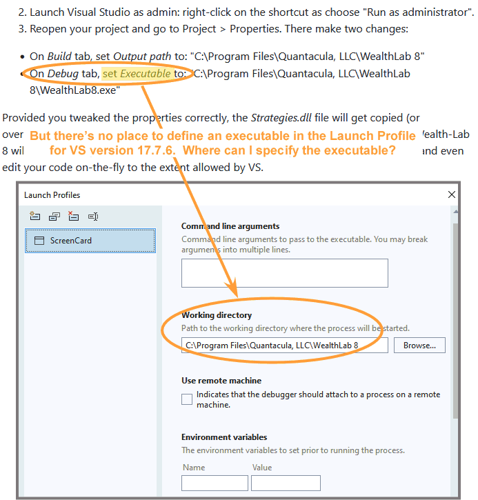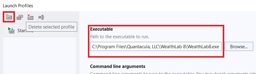 I renamed Profile1 to exec WealthLab8 and made that change; see screenshot below. That fixed the problem. Thanks guys. Gee, the docs detailing on how to do this are really lacking.