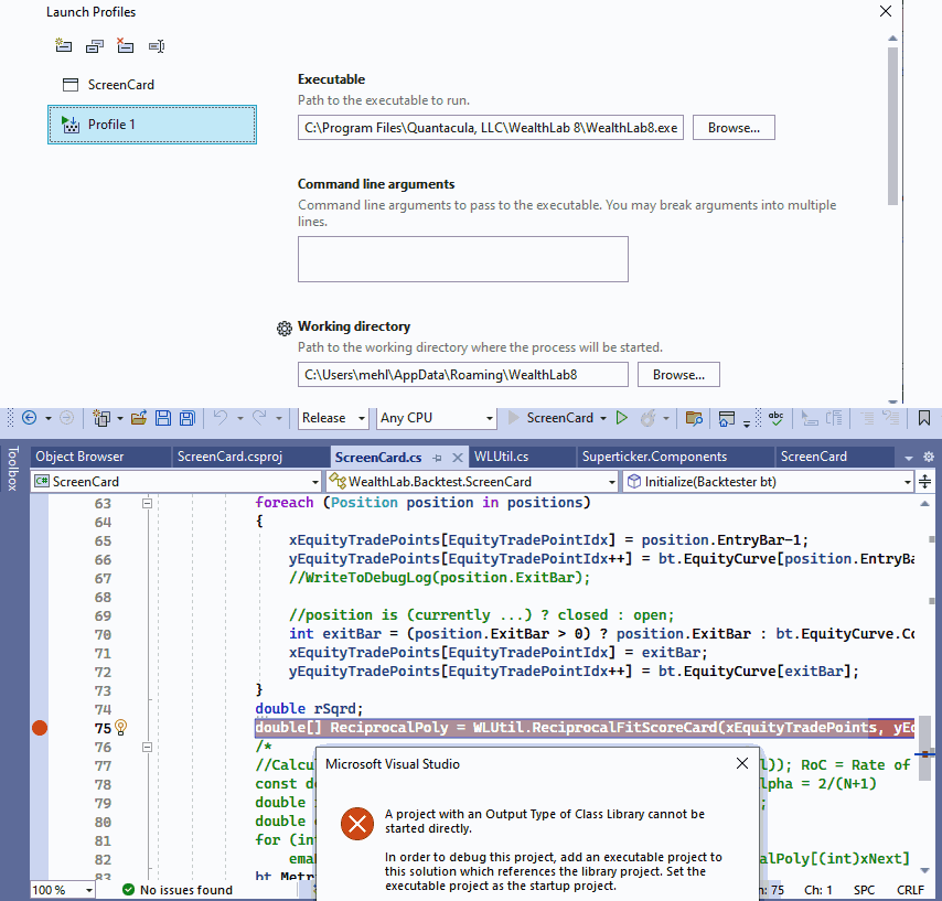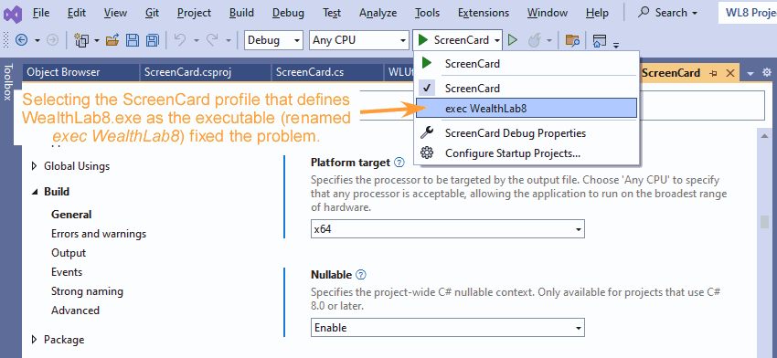 It looks like you're not using the new launch profile that you created. On the row where you selected Debug and AnyCPU, just to the right of those selections, change the launch profile from ScreenCard to Profile1, assuming that's the one you setup to point to the WealthLab8 executable.