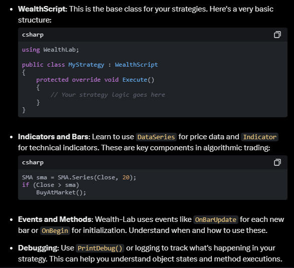 Just throwing out another idea: trying to re-train ChatGPT from scratch to create code not for "WL8" but for "NewWealthLab" (I was going to write Quantacula, but I think ChatGPT would also get confused and incorporate other non-compatible code in there), as a "new" (never before seen) language, with only WL8 compatible code (and "based on c#" syntax). But another concern I have with training an LLM is that some syntax is sometimes dependent on having the requisite modules available (a specific example being certain Options-related commands are available only on certain brokers/data sources). Somehow would need to "teach" the LLM of those certain caveats.