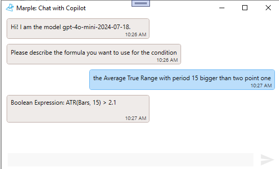 It is of course possible to "teach" the AI all this information, so if asked for a piece of code that means "the Average True Range with period 15 bigger than two point one" it produces somewhat correct code: