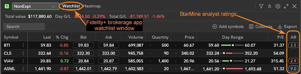 Below is a screenshot of the watchlist for the Fidelity Trader+ app.