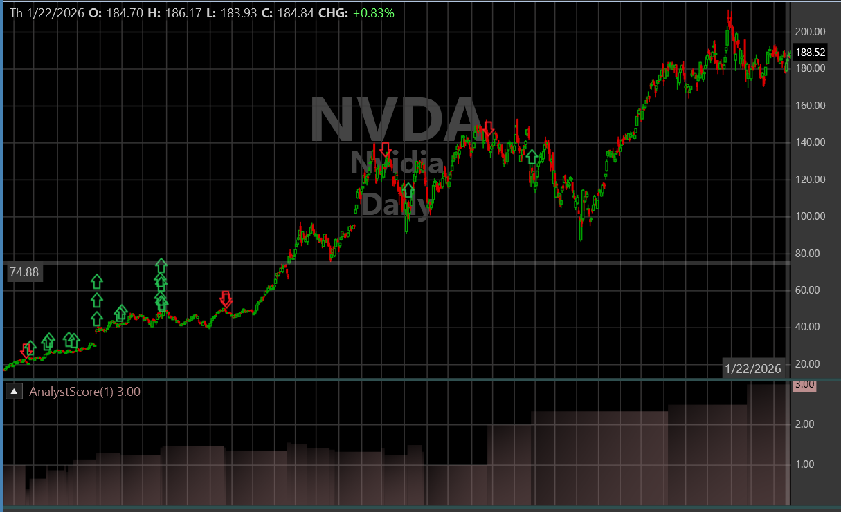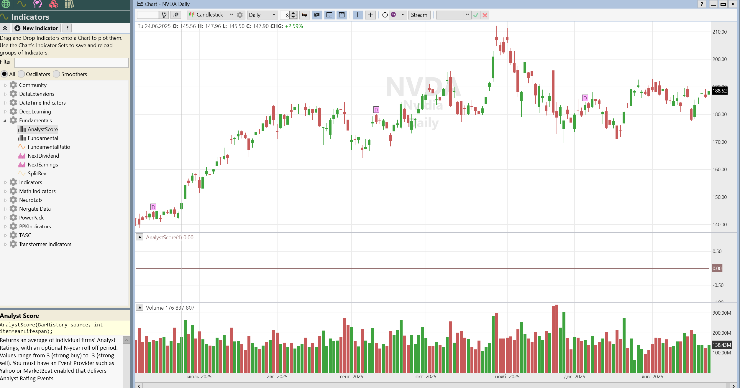 AnalystScore - Returns an average of individual firms' Analyst Ratings, with an optional N-year roll off period. Values range from 3 (strong buy) to -3 (strong sell). You must have an Event Provider such as Yahoo or MarketBeat enabled that delivers Analyst Rating Events.