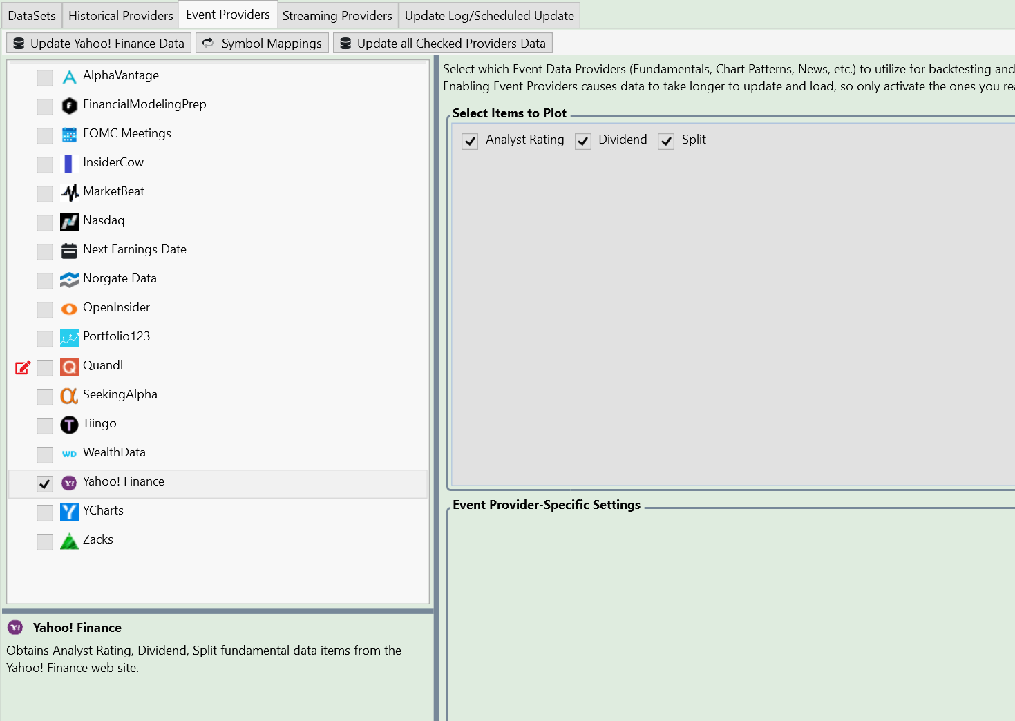Instead, select Event Providers > Yahoo. Analyst Ratings are working there, which will be used by the AnalystScore indicator.