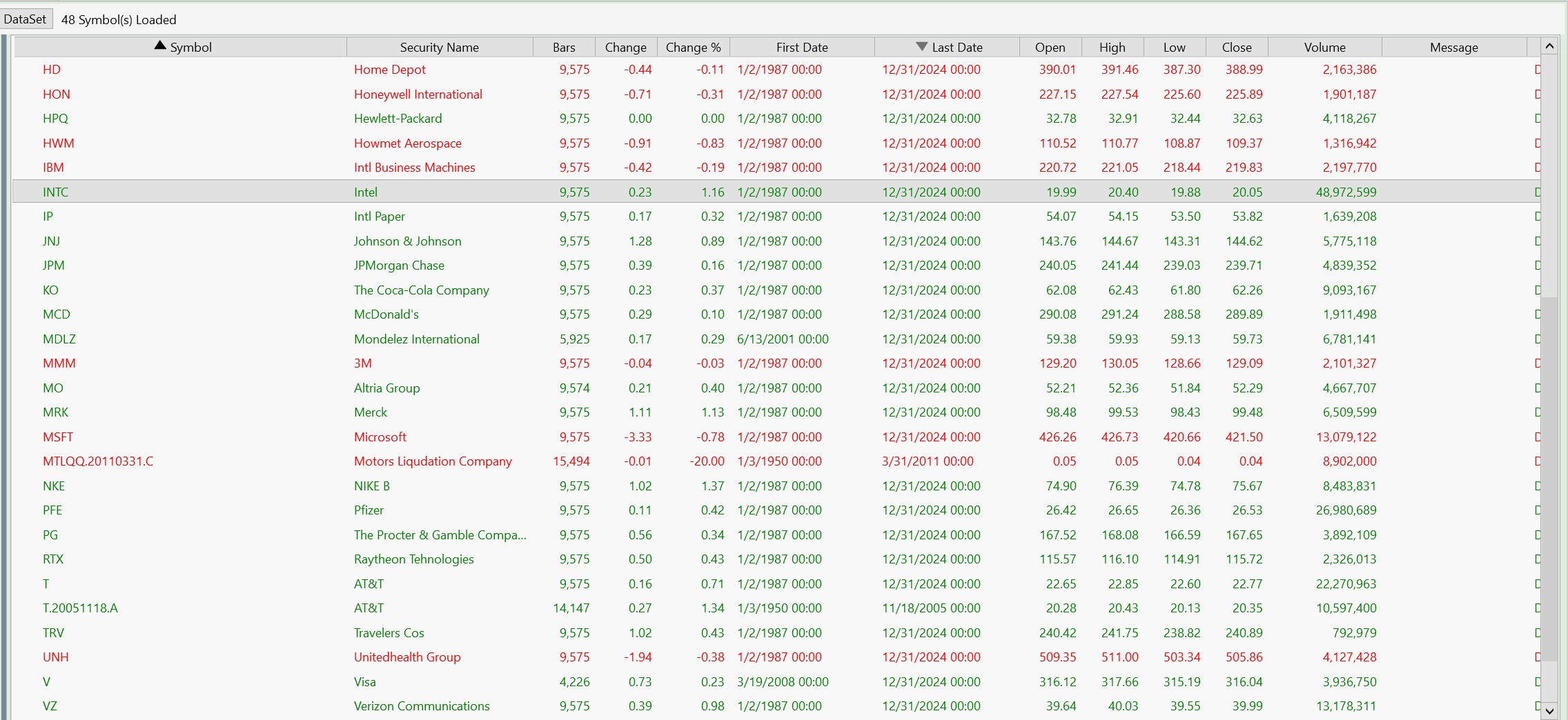 INTC should be there but you miss how the dynamic DataSets work in WL8. All the symbols that ever entered the DataSet remain there but are included and excluded from the backtest automatically on their in/out dates. Check this out: