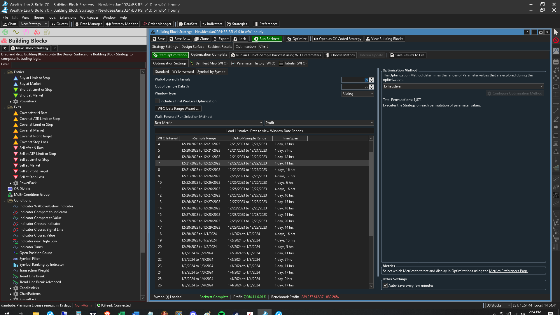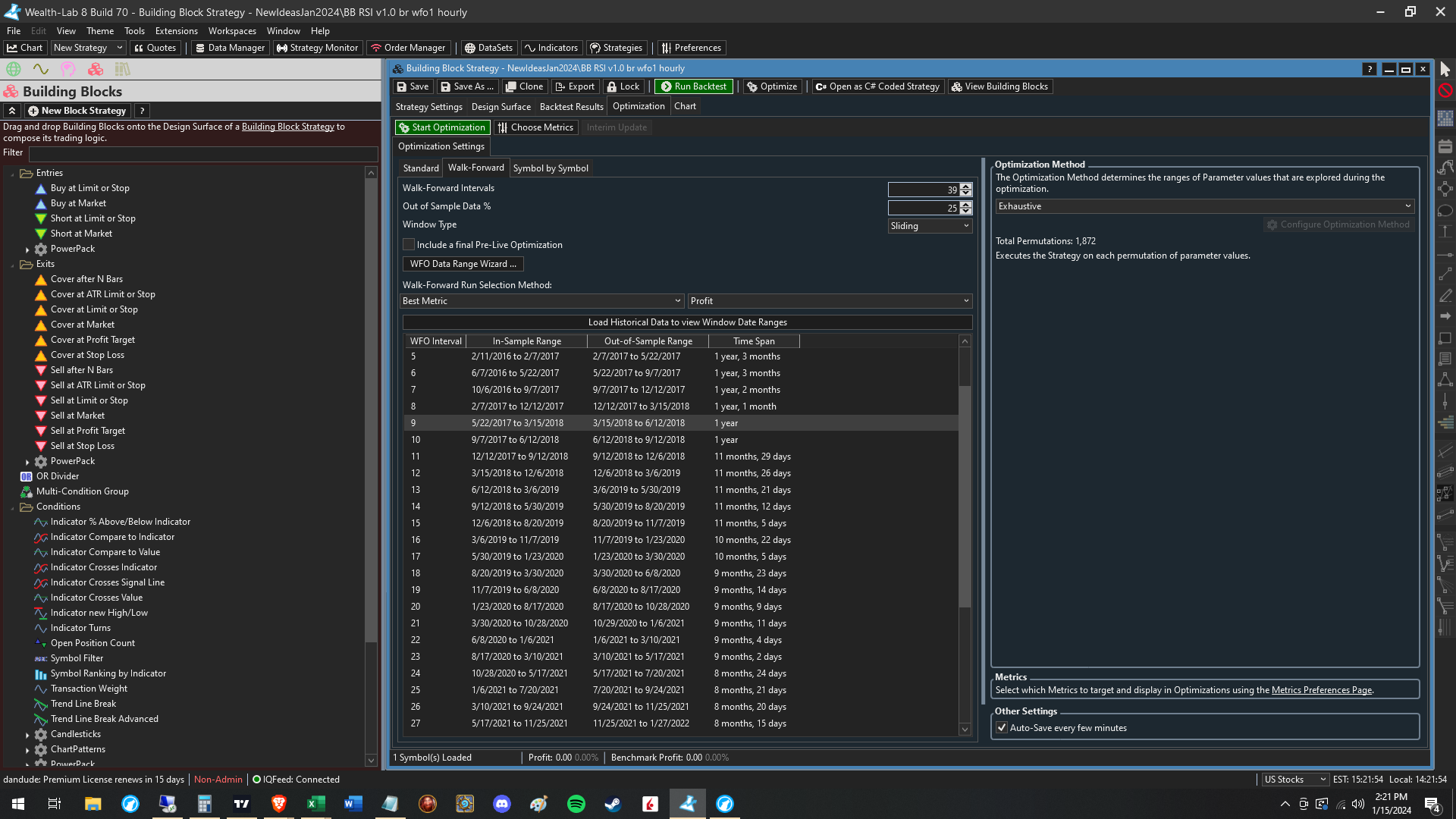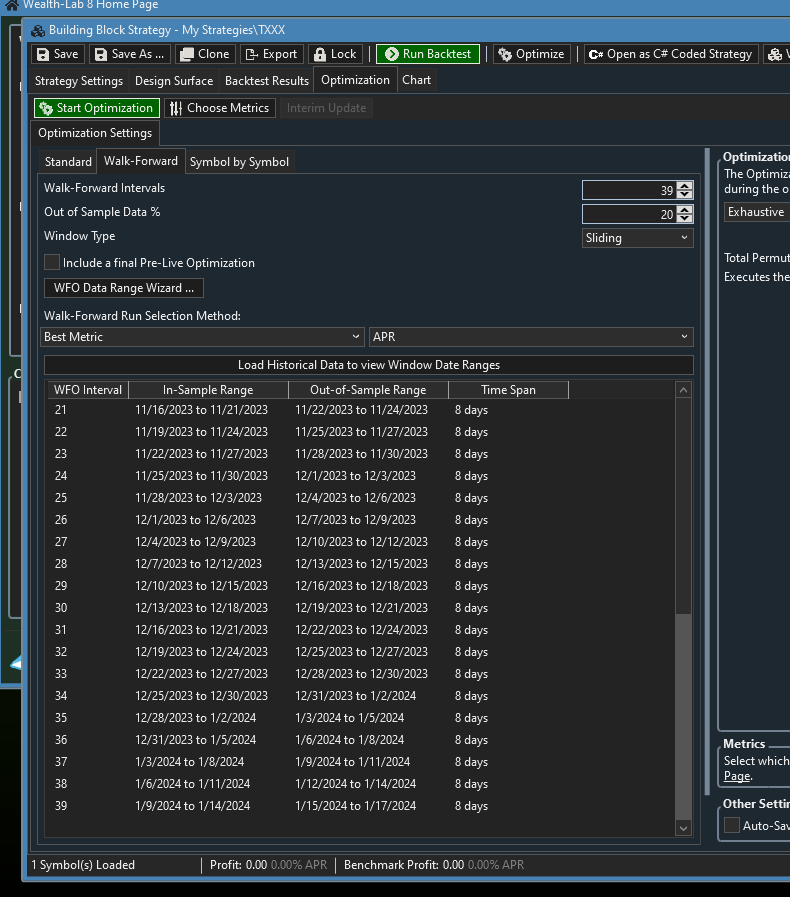 Making good progress in changing how the WFO windows are calculated. It's calendar based now instead of keying off the actual data points. I don't think either way is right or wrong, but I think most people will make better sense of this calendar-based approach.
