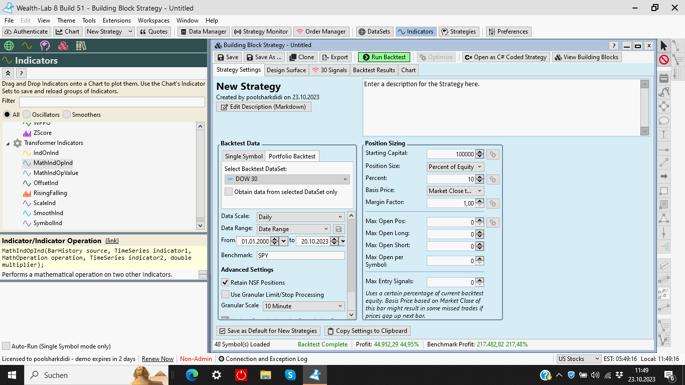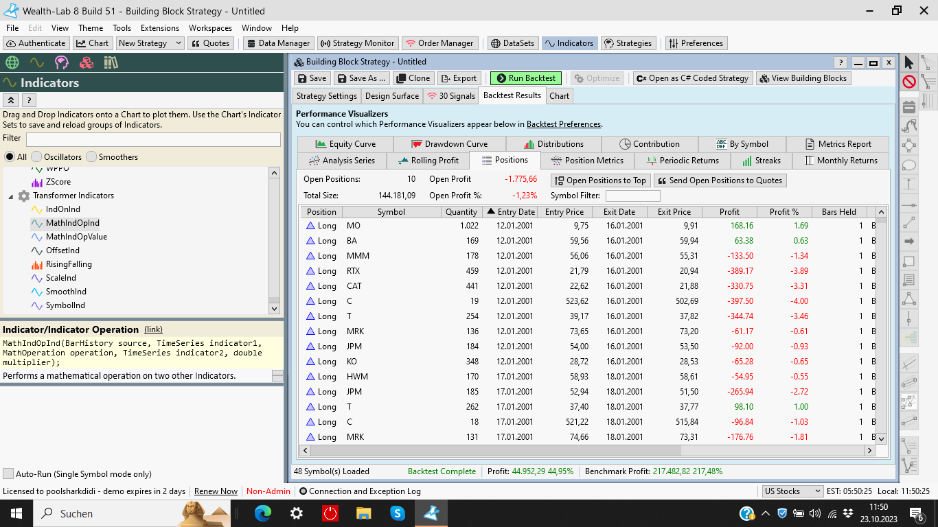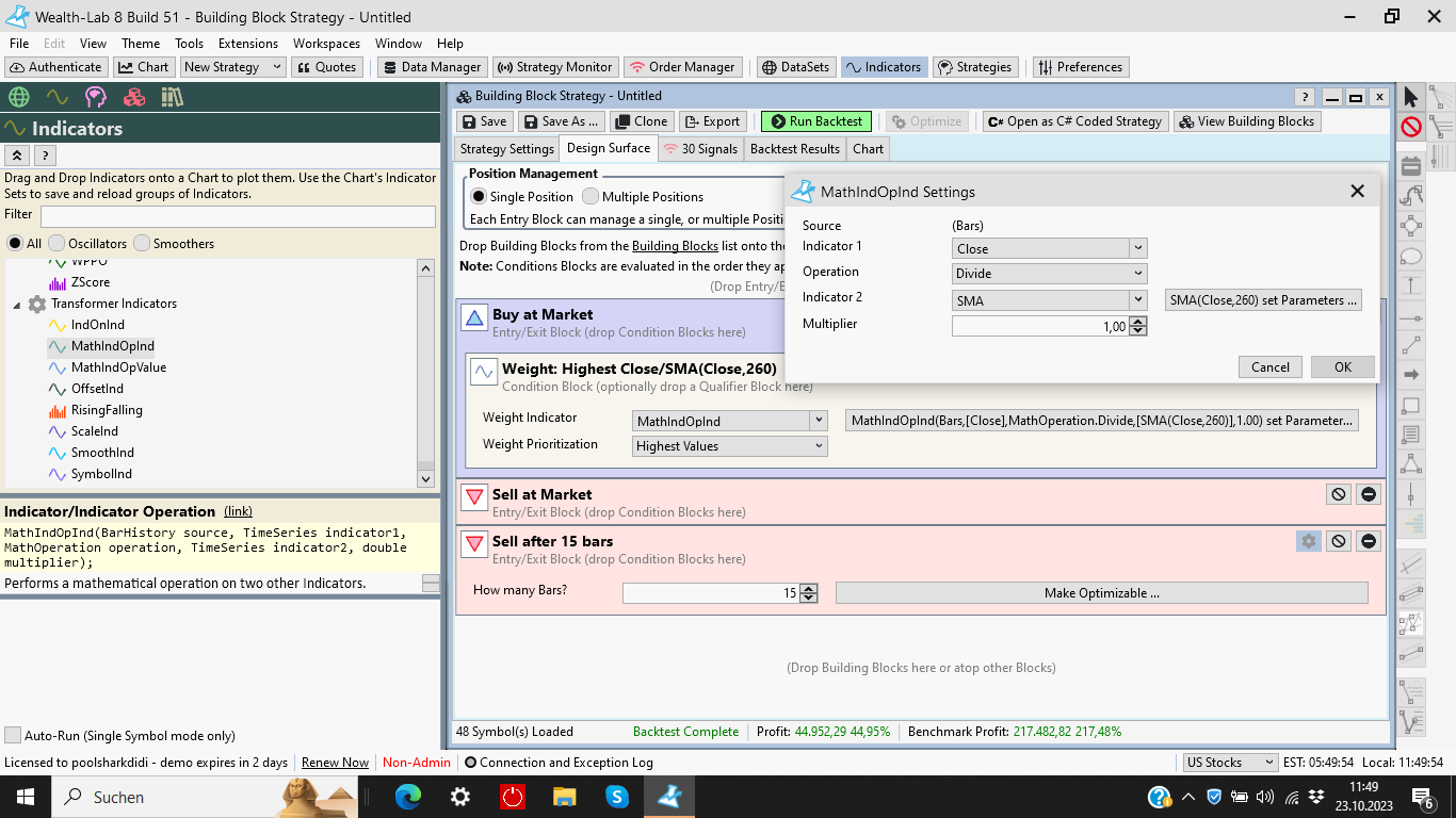 As can be seen, the backtest is to start on 01.01.2000. As a start I choose Transaction Weight with the MathIndOpInd where the close is divided by the SMA 260. First trade is executed only on 12.01.2001.