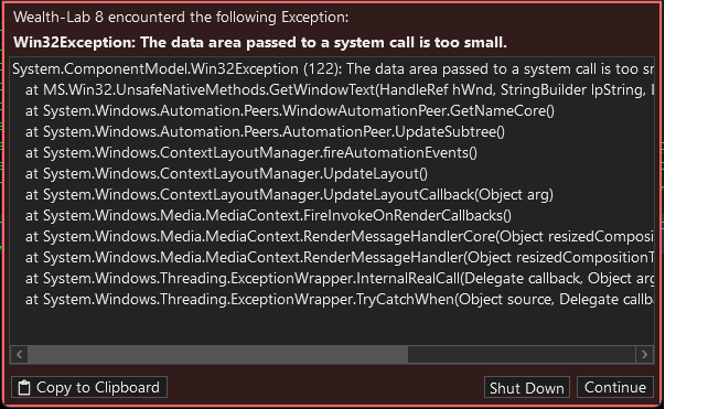 System.ComponentModel.Win32Exception (122): The data area passed to a system call is too small. at MS.Win32.UnsafeNativeMethods.GetWindowText(HandleRef hWnd, StringBuilder lpString, Int32 nMaxCount) at System.Windows.Automation.Peers.WindowAutomationPeer.GetNameCore() at System.Windows.Automation.Peers.AutomationPeer.UpdateSubtree() at System.Windows.ContextLayoutManager.fireAutomationEvents() at System.Windows.ContextLayoutManager.UpdateLayout() at System.Windows.ContextLayoutManager.UpdateLayoutCallback(Object arg) at System.Windows.Media.MediaContext.FireInvokeOnRenderCallbacks() at System.Windows.Media.MediaContext.RenderMessageHandlerCore(Object resizedCompositionTarget) at System.Windows.Media.MediaContext.RenderMessageHandler(Object resizedCompositionTarget) at System.Windows.Threading.ExceptionWrapper.InternalRealCall(Delegate callback, Object args, Int32 numArgs) at System.Windows.Threading.ExceptionWrapper.TryCatchWhen(Object source, Delegate callback, Object args, Int32 numArgs, Delegate catchHandler)