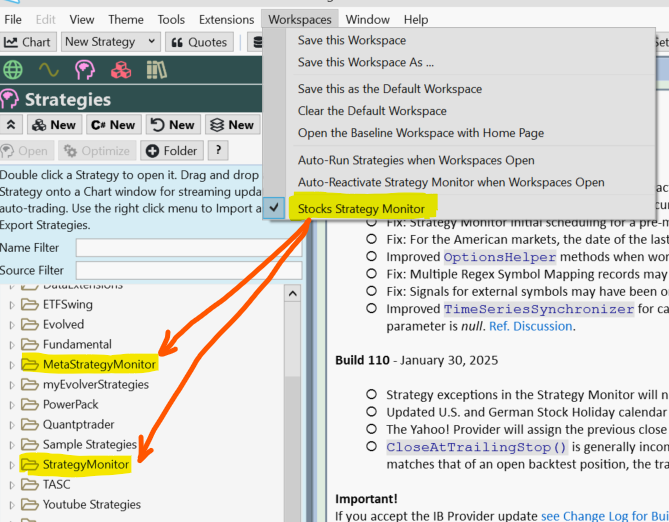 QUOTE:Your screenshot attached shows that your workspace "Stocks Strategy Monitor" is checked while the baseline workspace (Wealth-Lab 8 Home Page) remains open.