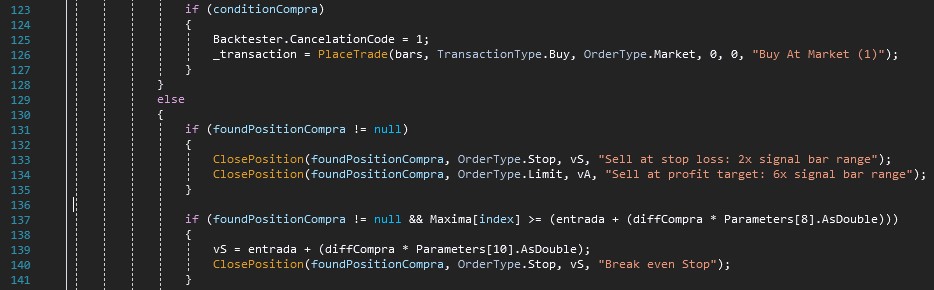 if (foundPositionVenda != null) { PlaceTrade(bars, TransactionType.Cover, OrderType.Stop, vS, "Stop Loss"); PlaceTrade(bars, TransactionType.Cover, OrderType.Limit, vA, "Take Profit"); } if (foundPositionVenda != null && Minima[index] <= (entrada - (diffVenda * Parameters[9].AsDouble))) { vS = entrada - (diffVenda * Parameters[11].AsDouble); PlaceTrade(bars, TransactionType.Cover, OrderType.Stop, vS, "Break even Stop"); }