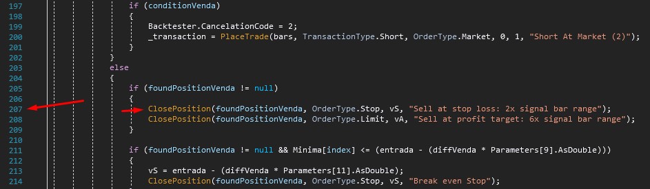 if (foundPositionVenda != null) { ClosePosition(foundPositionVenda, OrderType.Stop, vS, "Sell at stop loss: 2x signal bar range"); ClosePosition(foundPositionVenda, OrderType.Limit, vA, "Sell at profit target: 6x signal bar range"); } if (foundPositionVenda != null && Minima[index] <= (entrada - (diffVenda * Parameters[9].AsDouble))) { vS = entrada - (diffVenda * Parameters[11].AsDouble); ClosePosition(foundPositionVenda, OrderType.Stop, vS, "Break even Stop");