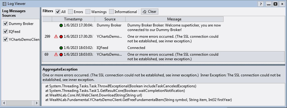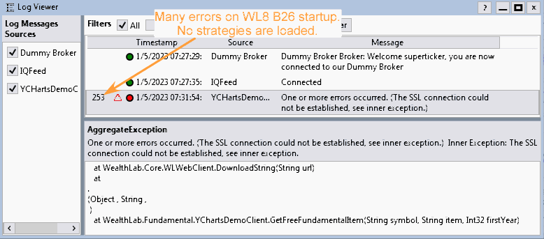 When I start WL8 Build 26, the error logger gives many YCharts errors concerning the SSL connection to YCharts; see screenshot. I haven't seen this in Build 24. I'm running DataExtensions Build 7 and Fundamental Extension Build 5.