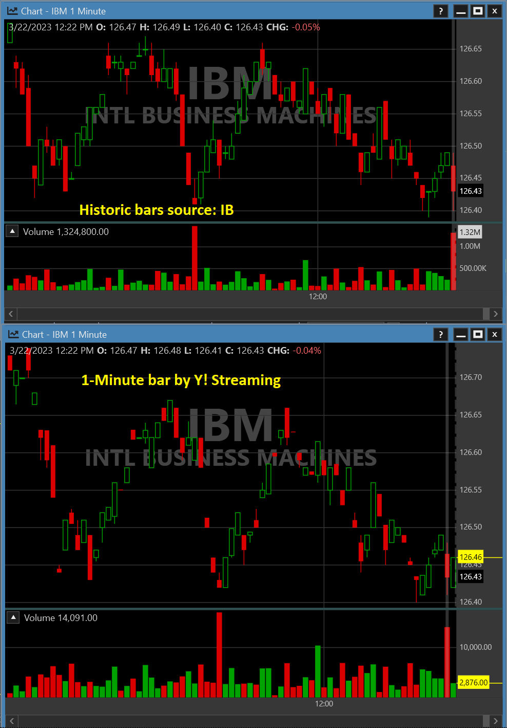 I ran four 1-Minute charts for an hour, but the first one convinces me that Y! is certainly not a good choice for Streaming Bars. The top image are the true historic bars from the provider, where as the second chart were built from Yahoo! Streaming. Judging by the volume, you're getting only about 2% of the actual trading with Y!.