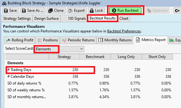 The metric "NumTradingDays" is calculated by the "Elements" Scorecard. You should see this in Backtest Results->Metrics Report if you choose "Elements" in the "Select ScoreCard:" combobox after a backtest: