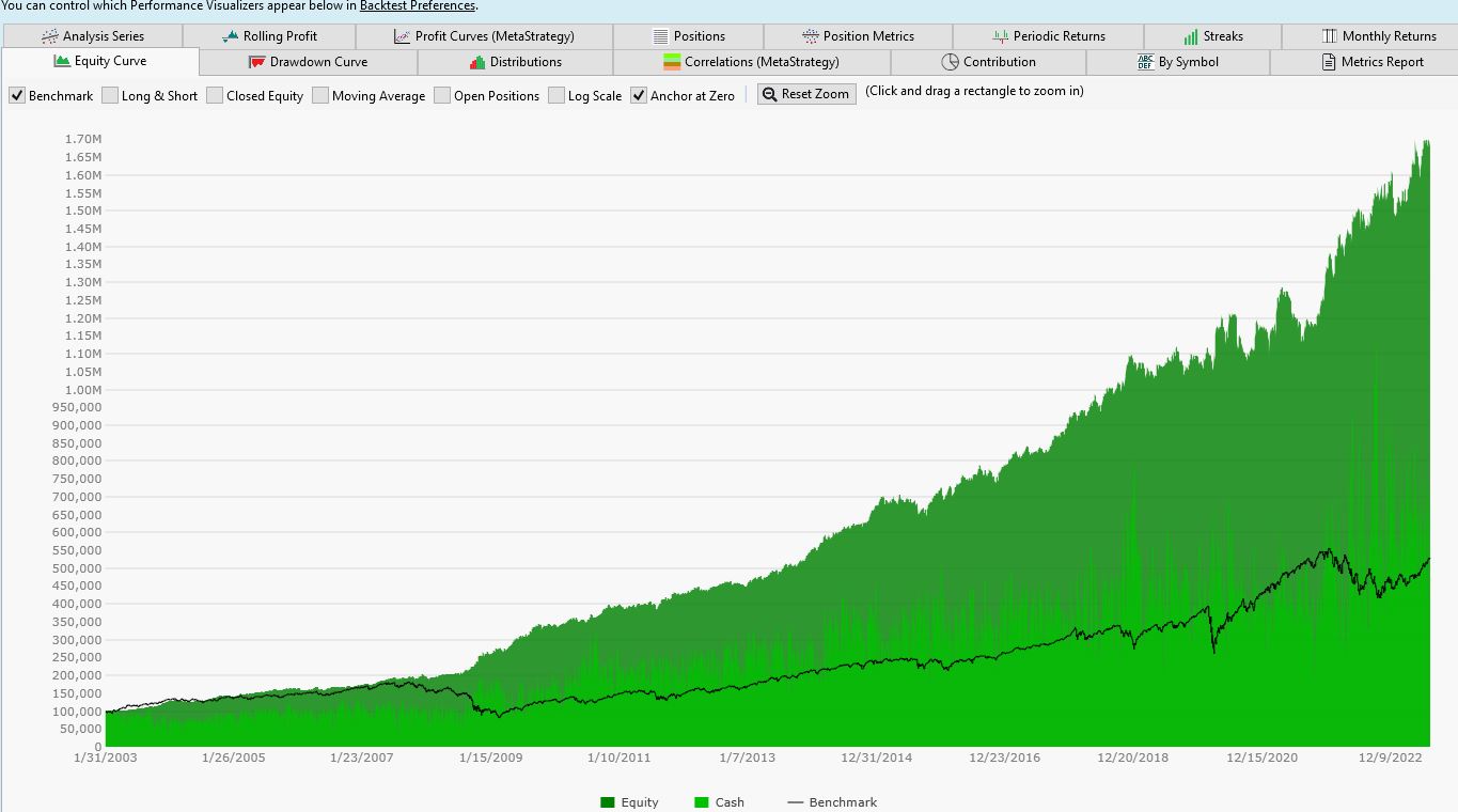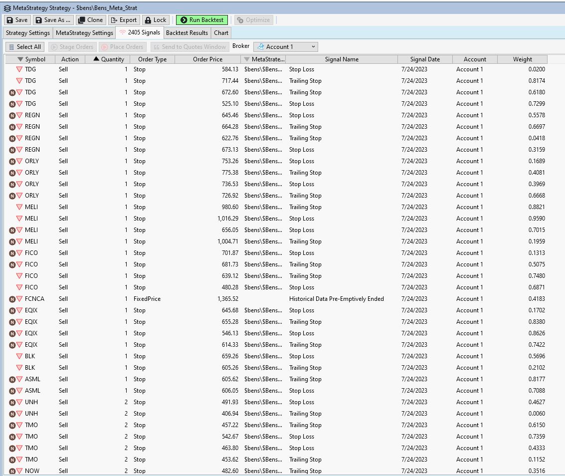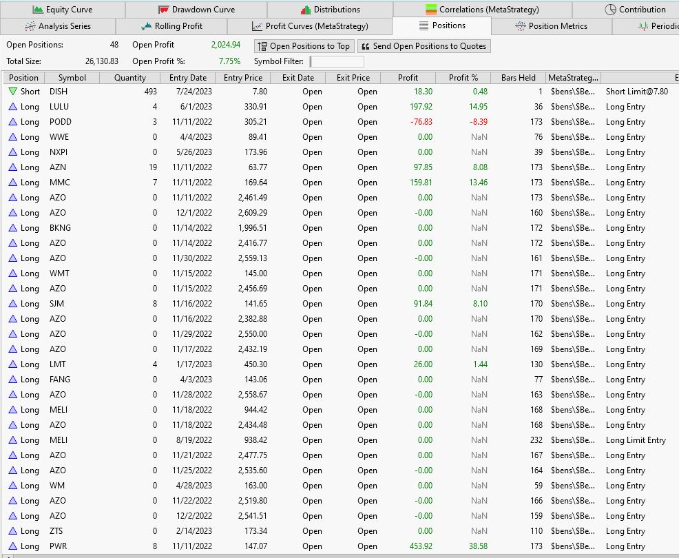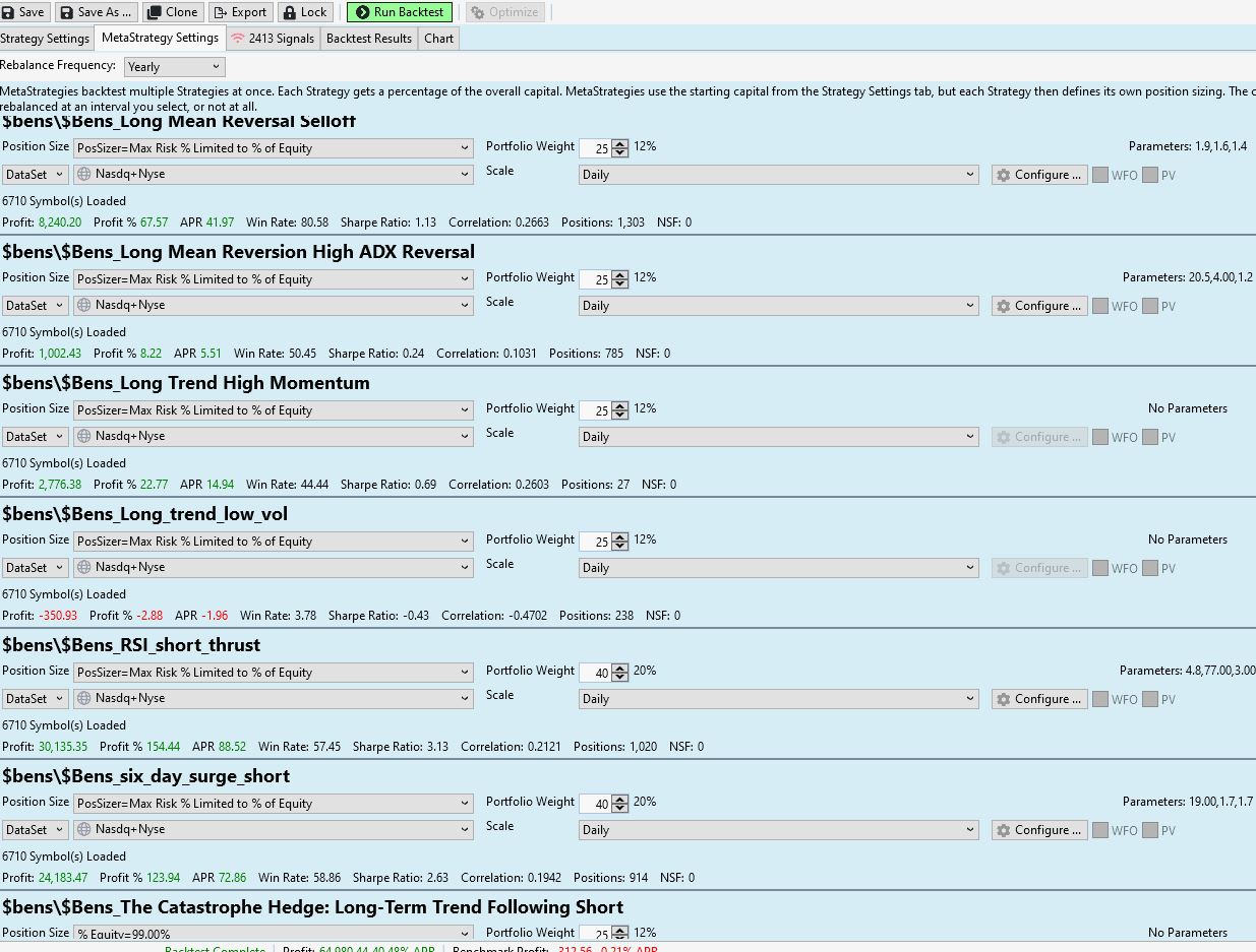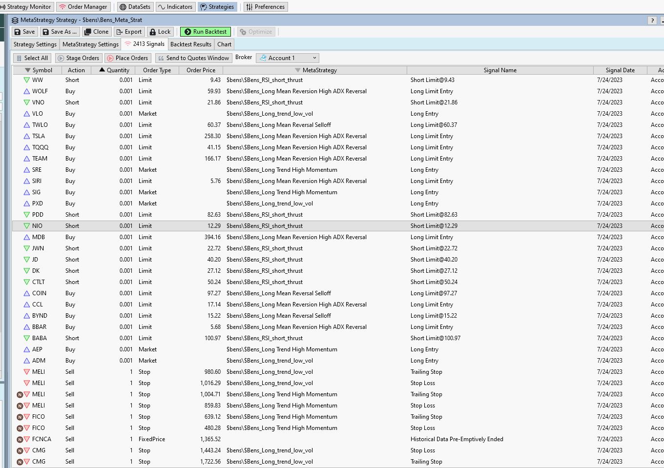 Greetings, I am working on backtests using the WL published Bensdorp strategies by DrKoch. Using the metastrategy framework with the entire Nasdaq and NYSE as a dataset(yahoo) and the original portfolio weights, metastrategy output signals produce order quantities of .001 shares. Furthermore after clicking on the signal to observe the signals on a chart there appears to be open orders of different quantities (unsure if this is related). I am new to wealthlab so forgive me if there is an obvious fix. Also, any recommendations or directions to documentation on the best way to implement the tracking of signals from metastrategies that use large data sets would be greatly appreciated.