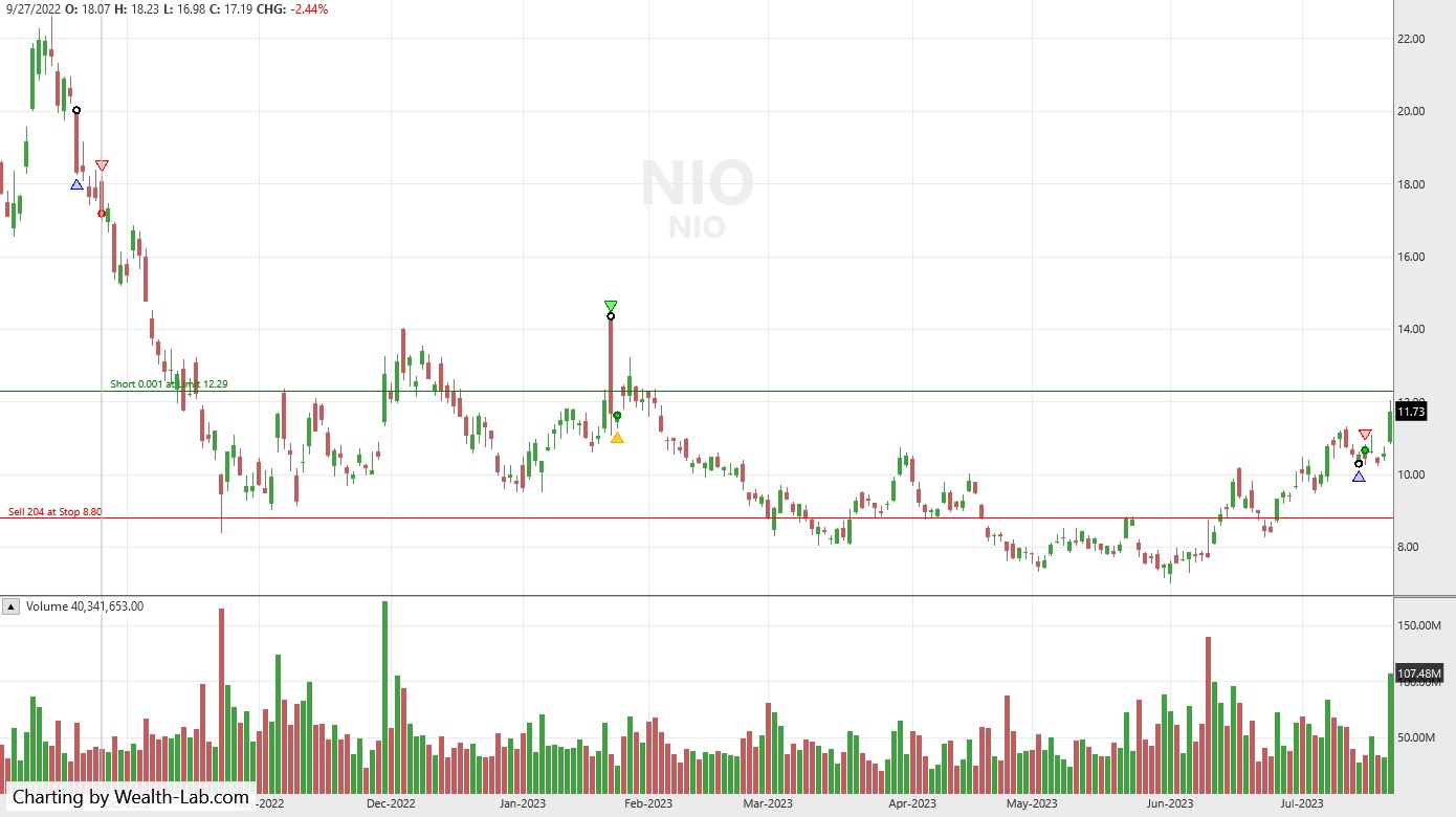 # NIO chart showing .001 limit (short) order and sell stop for 204 shares at a lower