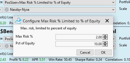 Interestingly using the Dr Koch's position sizer during 20 year back tests, with the entire nasdaq and nyse data set, it comes very close to what Mr. Bensdorp discussed in his book and would be willing to assume that because the erroneously sized positions are so small that they had little effect on the back test results (sorry dont have screen shots of these but can re run in if anyone is interested). In conclusion it would be well worth it to have the max risk % / max equity % working. Thanks for the help.