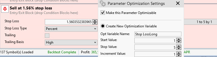 If we choose a Sell at Stop Loss in a range of 1-5% as an exit, then this Stoploss value range will be displayed incorrectly in the Parameters and Metric view.