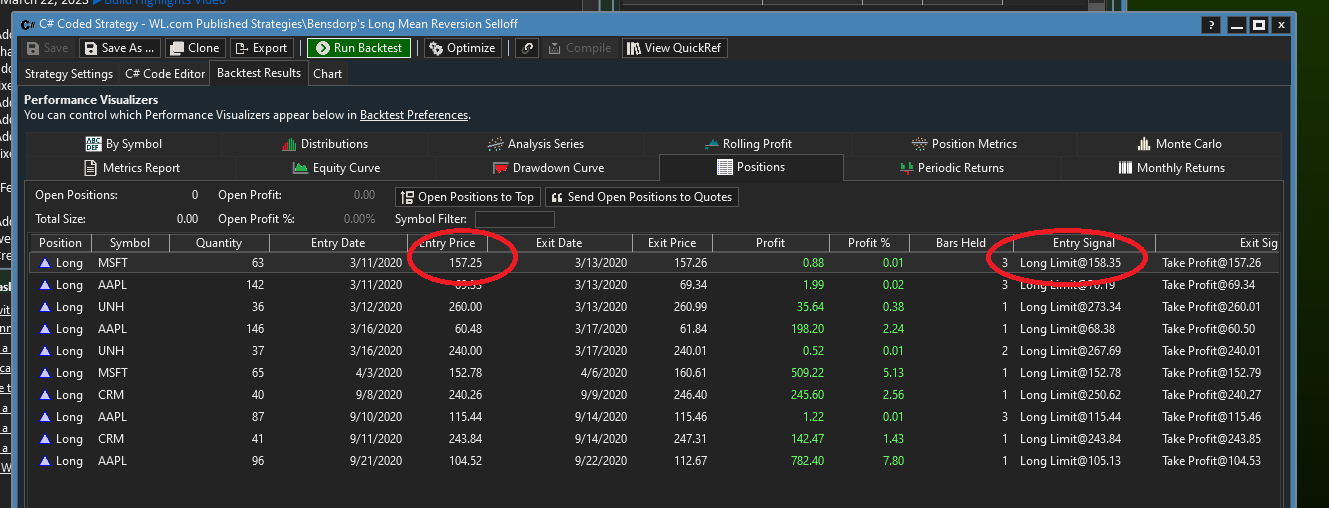 As far as I can tell, the Long Mean Reversion Selloff algorithm's excellent performance is almost completely due to the negative slippage of the Take Profit limit order. If one has the ability to execute an order and get 0.8% price improvement, does the algorithm that generated the trade even matter at that point? Or does WealthLab internally model the executed price as a function of the target limit price and the daily ohlc prices, and the Long Mean Reversion Selloff algorithm is somehow resonating with this internal model and finding the most advantageous days to place these limit orders?