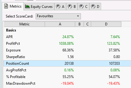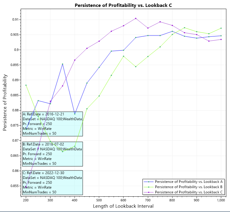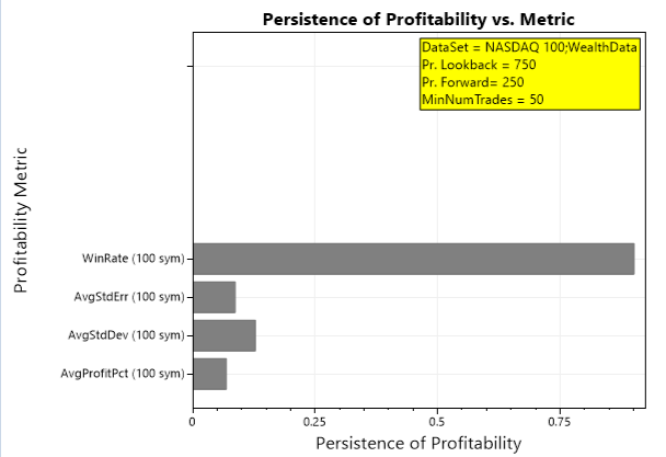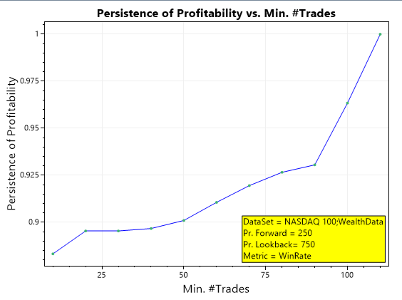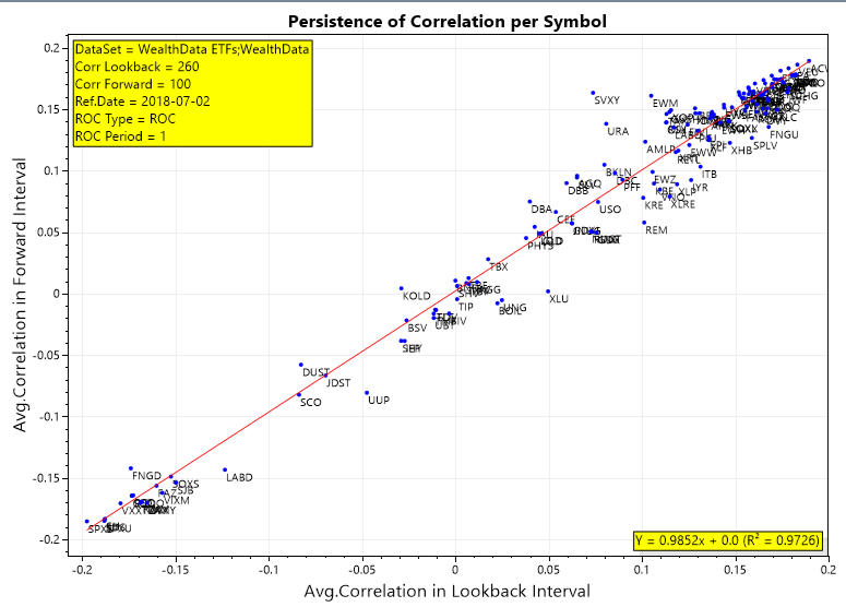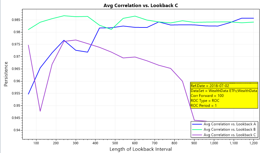 There is a number of plots that visualize the various settings and their effect on the outcome. These plots show the persistence of Correlations or Profitability. Please make sure you have the finantic.InteractiveGraphics extension installed.